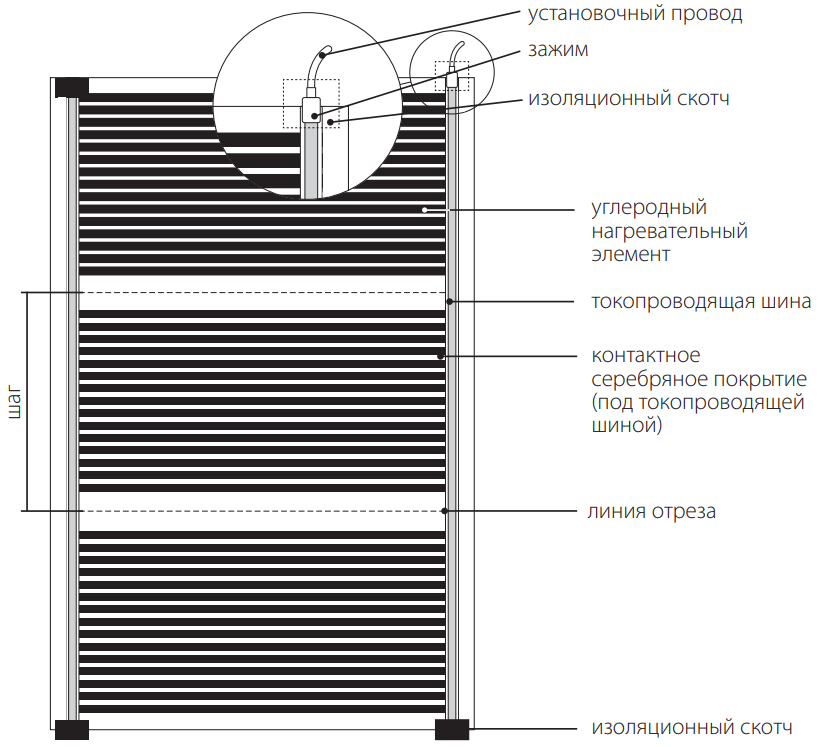 Полоса нагревательной пленки состоит из нагревательных ячеек (шагов), конструкция которых идентична.