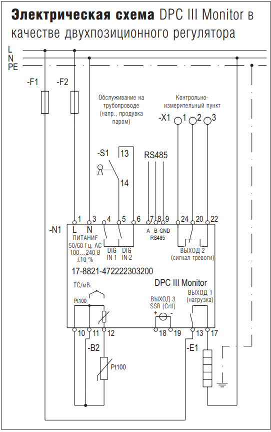 Регулятор температуры DPC III Monitor (17-8821-4722/22303200) представляет собой базовый регулятор, который с заводскими установками может использоваться в качестве двухпозиционного регулятора с двумя релейными выходами для регулирования и аварийных сигналов, а также для наиболее распространенных приложений. Так как основные установки выполнены на заводе, необходимо установить только заданное значение, а также аварийное значение (значения). Функция Easy Start-up позволяет сделать это пользователю легко и просто. В качестве альтернативы подобный прибор может использоваться в качестве регулятора с характеристикой ПИД-регулирования и внешним полупроводниковым реле. Версия Monitor оснащена интерфейсом RS485 и протоколом MODBUS.