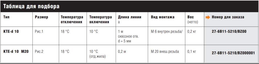 Чрезвычайно компактный, встроенный в кабель биметаллический терморегулятор KTE-d 27-6B11-5210BZ00 используется прежде всего во взрывоопасных условиях, в которых приборы необходимо защищать от мороза. Этот терморегулятор может использоваться как для внешнего температурного контроля, так и для регулирования внутренними температурами распределительных шкафов и шкафов управления, преобразовательных и предохранительных коробок, измерительных устройств и т.д. Кроме того он применяется для контроля (сигнализации) пониженных и повышенных температур или даже в качестве контакта сигнализации.