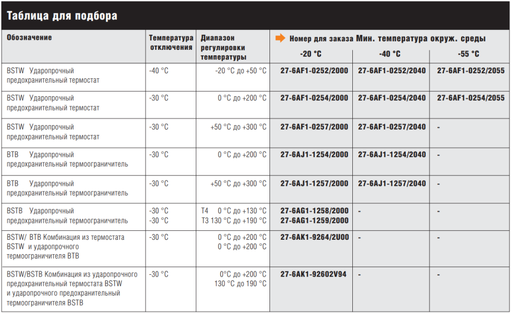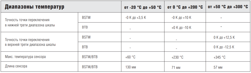 Изменение температуры на сенсоре вызывает изменение объема измерительной системы, заполненной жидкостью. В результате этого начинает двигаться мембрана. Мембрана связана с передаточным механизмом и воздействует на микропереключатель. Если температура сенсора превышает заданное значение, клемма 1/4 незамкнута. BTB/BSTB при превышении температуры постоянно отключен. После снижения температуры (прим. на 9 % ниже заданного значения) ВТВ/ BSTB может быть вручную разблокирован. При поломке измерительной системы (утечка) электрическая цепь остается незамкнутой. Если температура чувствительного элемента опускается ниже допустимой, система автоматического контроля отключает электрическую цепь, а при повышении автоматически замыкает.Область применения BTB (27-6DJ2-5232/1300)