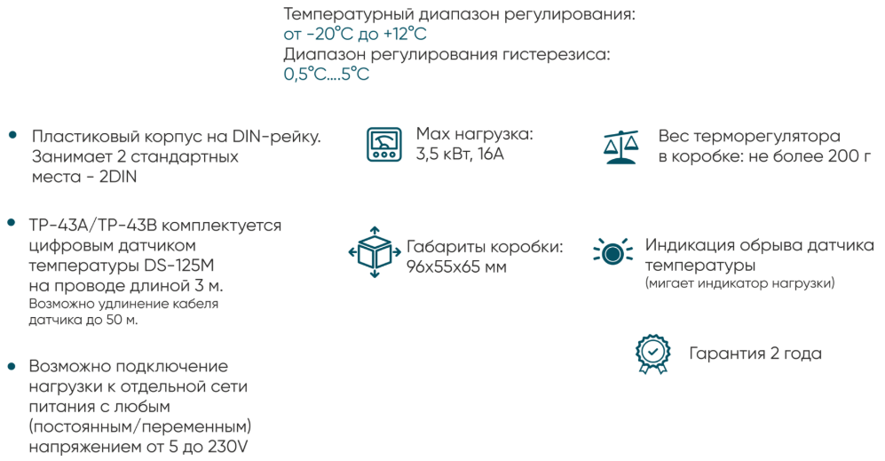 гистерезис: 0,5 ... 5°С (нижний регулятор); - Пластиковый корпус на DIN-рейку. Занимает 2 стандартных места - 2DIN;