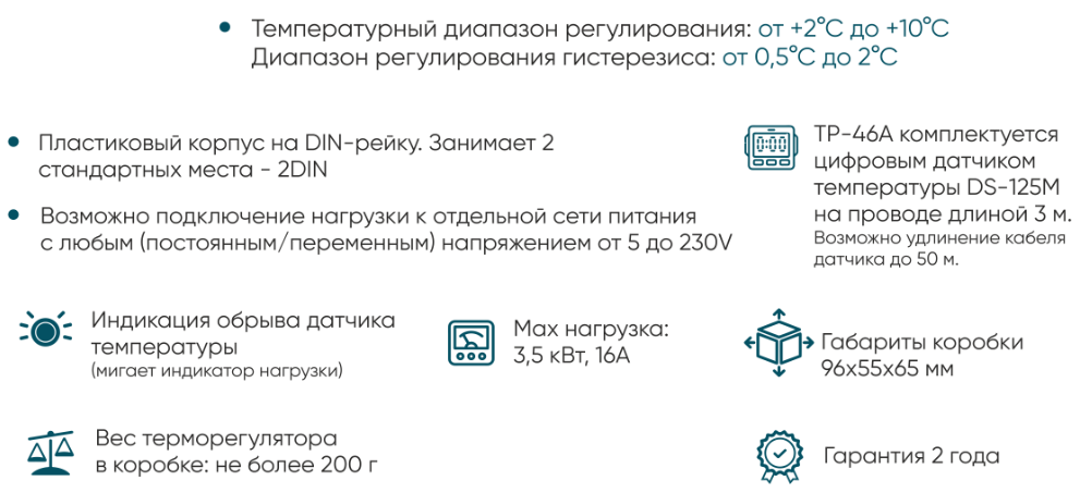 Гистерезис: 0,5 ... 5°С (нижний регулятор); - Пластиковый корпус на DIN-рейку. Занимает 2 стандартных места - 2DIN;