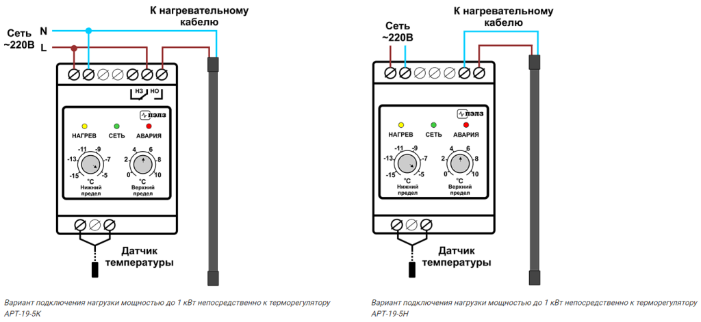 АРТ-19-5 с датчиком KTY-81-110 создан для управления антиобледенительными системами. Он включает нагрузку только внутри заданного диапазона температур. Например, если установить нижнюю границу диапазона −5°С, а верхнюю — +5°С, то нагрев будет включен только, если текущая температура находится в этих пределах, при температуре ниже −15°С и выше +5°С нагрев будет выключен. Поскольку, в разных случаях, границы этого диапазона могут различаться, пользователь может подстраивать их значение, подбирая, таким образом, оптимальный режим работы всей системы.