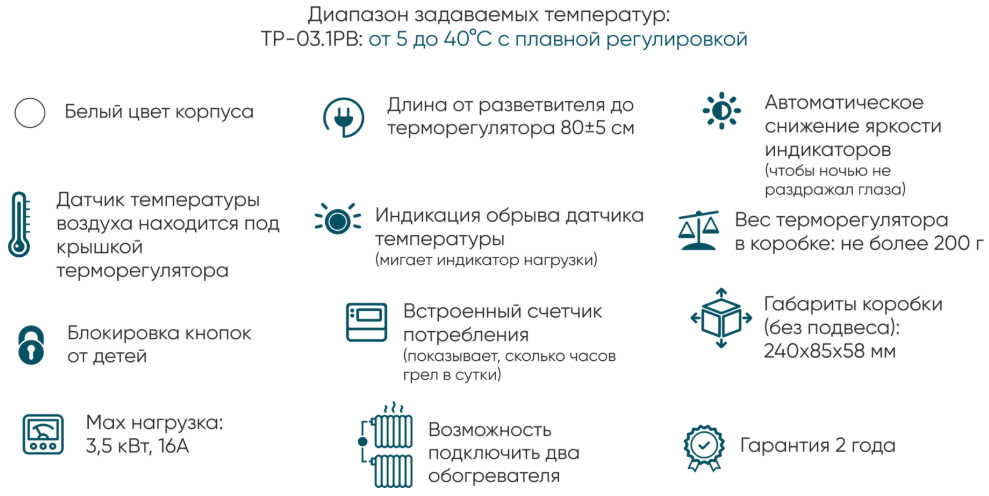 Эрголайт ТР-03.2РВ терморегулятор для обогревателей на проводе с разветвителем соответствует всем заявленным характеристикам и поставляется с официальной гарантией.