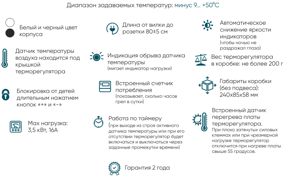 - Терморегулятор работает с любыми напольными и настенными электрическими обогревателями:
