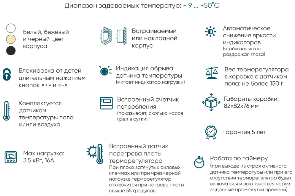 - Встроенный датчик перегрева платы терморегулятора;