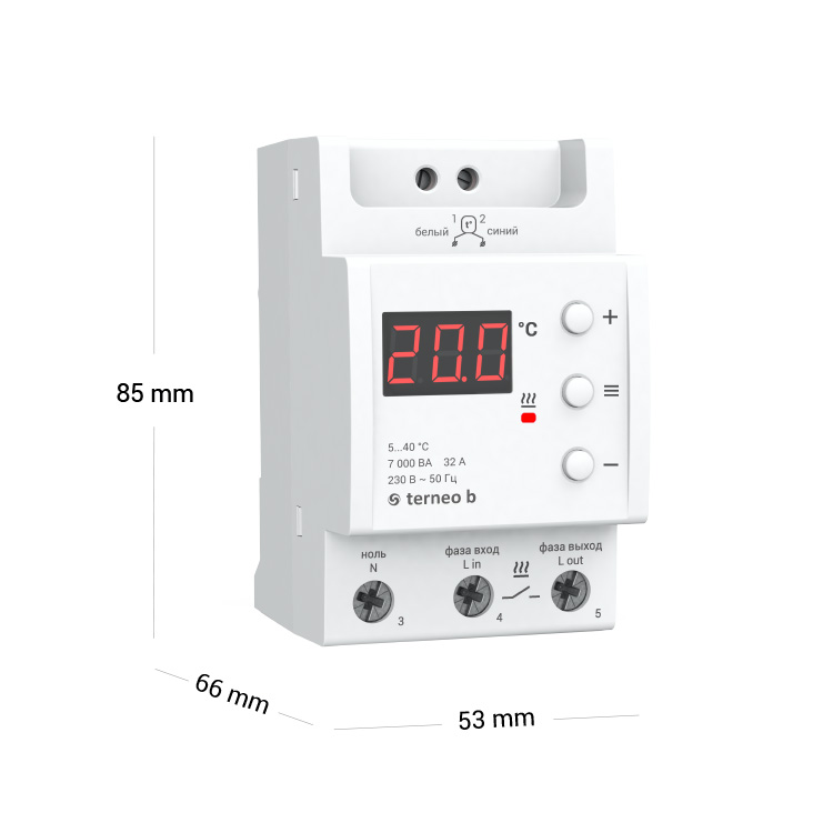 Терморегулятор Terneo b32A, белый предназначен для работы с системами «теплый пол» на основе электрического нагревательного кабеля. Особенностью этой модели является возможность применять ее с системами большой номинальной мощности (до 7000 ВА). Терморегулятор позволяет поддерживать заданное вами значение температуры от 5 до 40 °С. Данные о температуре поступают от датчика, помещенного в пол.
