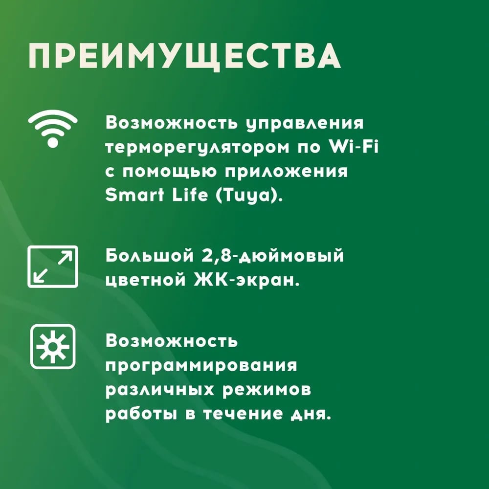 - Возможность управления терморегулятором по Wi-Fi с помощью приложения Smart Life (Tuya).