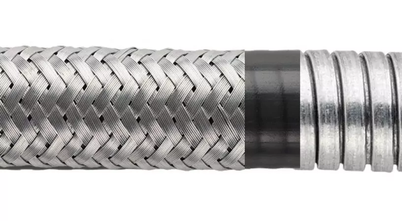Гибкий спиральный скрученный металлорукав из нержавеющей стали покрытый термопластичным каучуком в оплетке из нержавеющей стали серии LTPBRD