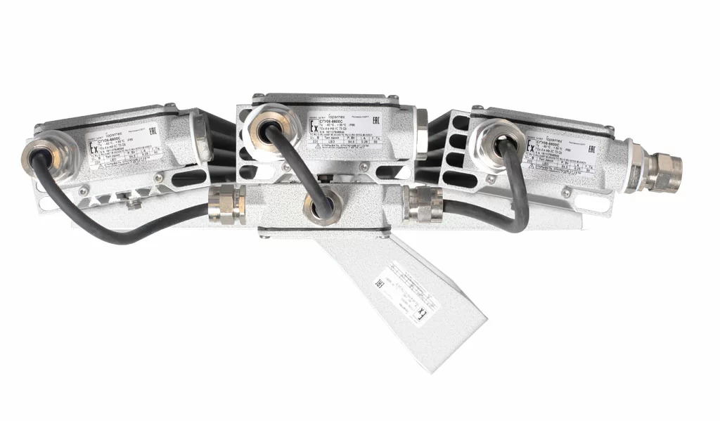 Конструкция взрывозащищенных светильников СГУ06-...С состоит из одного, двух или трех модулей мощностью 15 Вт (1860 Лм), 28 Вт (3300 Лм, 3720 Лм), 55 Вт (6600 Лм) или 110 Вт (13200 Лм), из которых собираются взрывозащищенные светодиодные светильники большей мощности (кратно мощностям используемых модулей).