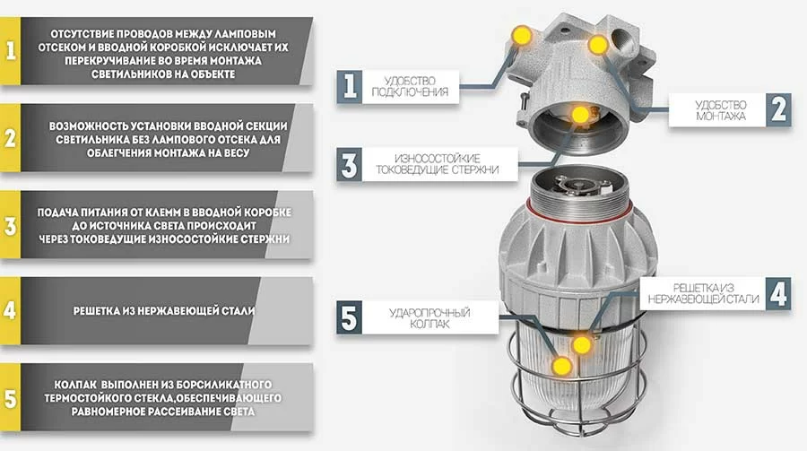 Во взрывозащищенных светодиодных светильниках серии СГЖ01-...С применяется вид взрывозащиты Exd взрывонепроницаемая оболочка. В отличие от взрывозащищенных светодиодных светильников других производителей с видом защиты Exm, где применяется компаундирование, светильники серии СГЖ01-...С разборные и ремонтопригодные. Отсутствие внешних компаундированных элементов, и применение термостойкого ударопрочного колпака вместо полимерных защитных линз и пластин не накладывает ограничений на температурные режимы эксплуатации светильников и стойкость устройства к ударным нагрузкам. Взрывозащищенные светодиодные светильники серии СГЖ01-...С лишены таких недостатков, как химическое и физическое старение полимеров. Фактически срок работы светильника равен сроку эксплуатации его взрывонепроницаемой Exd оболочки, что составляет более 25 лет.