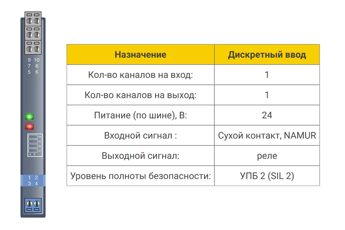Барьер предназначен для искробезопасной передачи дискретных сигналов (сухой контакт или датчик NAMUR) из взрывоопасной зоны в безопасную зону при помощи гальванической развязки. Сигналы входа, выхода и индикации неисправности гальванически изолированы друг от друга.