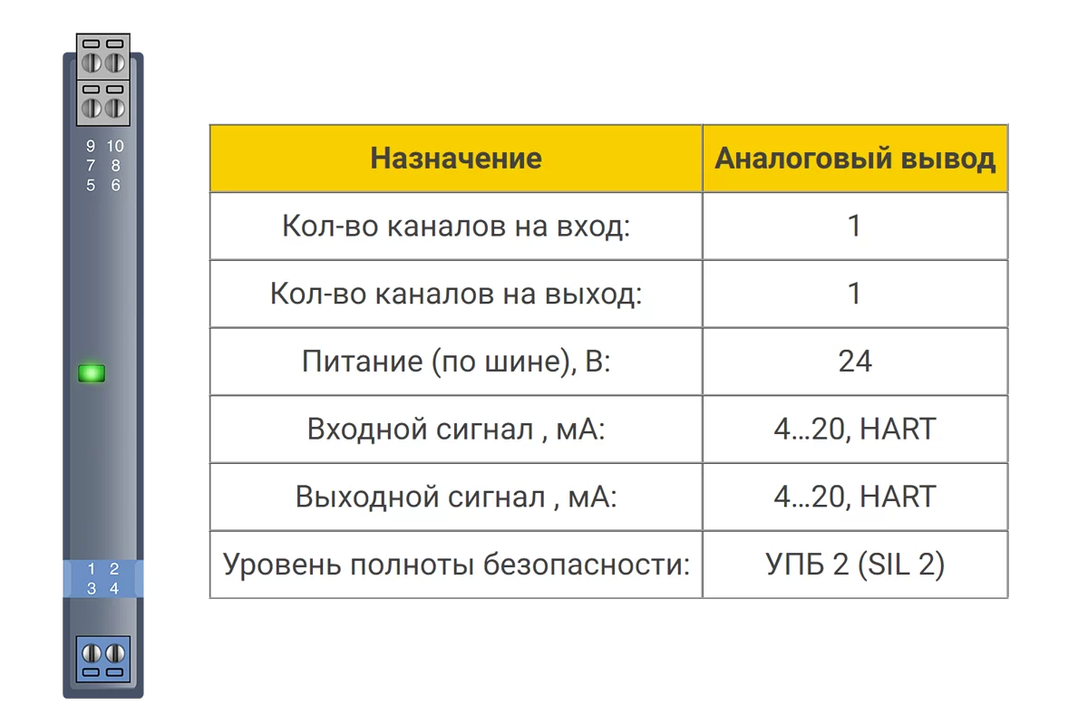 Барьер предназначен для искробезопасной передачи токового сигнала управления исполнительными приборами (I/P регуляторы, преобразователи) из безопасной зоны во взрывоопасную зону при помощи гальванической развязки. Позволяет передавать сигналы HART.